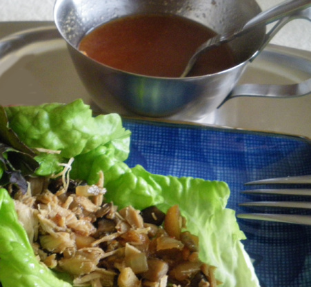 I use ground chicken and cook it until it's no longer pink. I then add all the other ingredients, and cook until heated through. All the rest is prepared/assembled as instructed. This saves quite a few steps and quite a bit of time. Besides, I'm not all that good at dicing up the cooked chicken breasts like they do at P.F. Chang's I will sometimes try to get away with not making the special sauce to pour over the top of the lettuce wraps. The hubs always mentions something about it to let me know he notices.